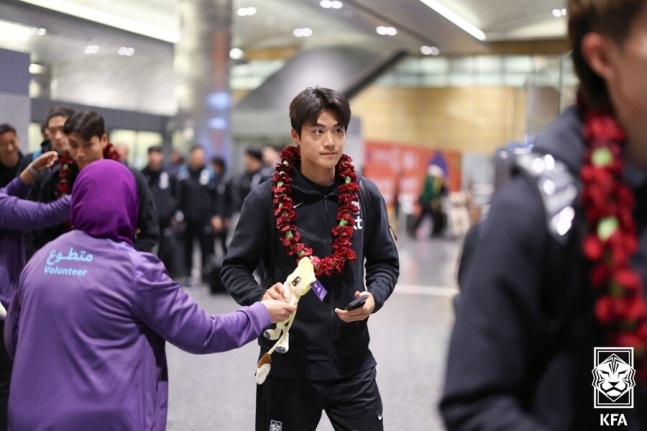 대한축구협회에 따르면 위르겐 클린스만 감독이 이끄는 축구대표팀이 현지 시간으로 10일 오후 카타르 도하의 하마드 국제공항을 통해 결전지에 입성했다. 64년 만에 아시안컵 트로피를 노리는 클린스만호 일원들은 대회 조직위원회가 준비한 꽃목걸이를 받으며 활짝 웃었다.