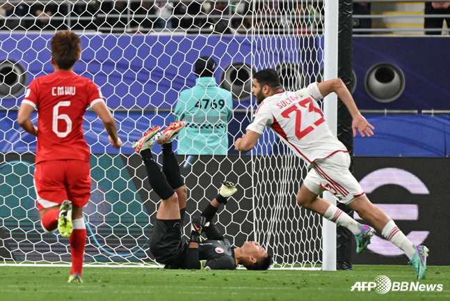 초반 팽팽한 흐름이 이어졌으나 전반 33분 UAE에 기회가 찾아왔다. 페널티박스 안에서 상대 반칙을 얻어내 페널티킥을 획득했다. 반칙이 일어난 곳이 페널티박스 라인에 걸쳐 있어 주심은 비디오판독(VAR)을 통해 다시 정확히 살펴봤다. 고민 끝에 주심은 페널티킥을 선언. 키커로 나선 알라미리가 가볍게 밀어 넣었다.