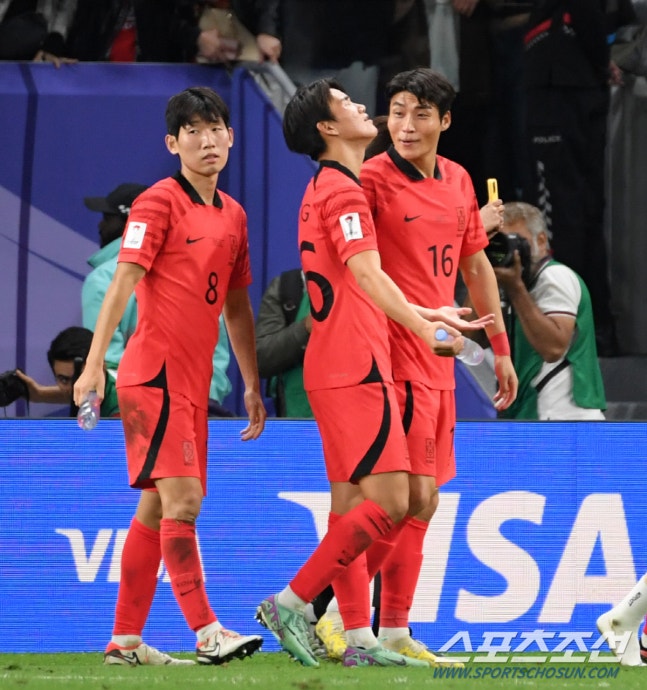 2일(현지시간) 카타르 알와크라 알자누브 스타디움에서 열린 2023 아시아축구연맹(AFC) 카타르 아시안컵 8강전 대한민국과 호주의 경기. 경기에서 승리한 대한민국 선수들이 기뻐하고 있다.