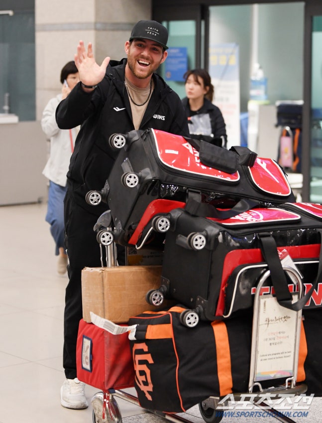 [인천공항=스포츠조선 박재만 기자] 시차 적응도 안 된 상황에서 짐 한가득 싣고 나오던 LG 트윈스 외국인 타자 오스틴이 입국장을 나서며 자신을 반기는 야구팬들을 향해 모자까지 벗고 90도 인사를 건넸다.