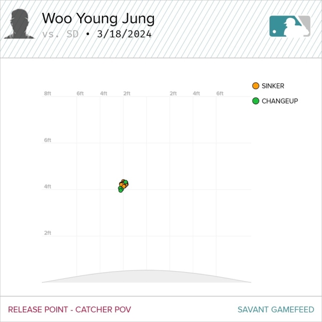정우영이 가장 빠른 공을 던졌던 시기는 2022년으로, 당시 투심 패스트볼 평균 구속이 시속 151.6㎞까지 나왔다. 구속만 보면 메이저리그에서 평범한 수준 같지만 정우영의 유형까지 고려하면 그렇지만은 않다.