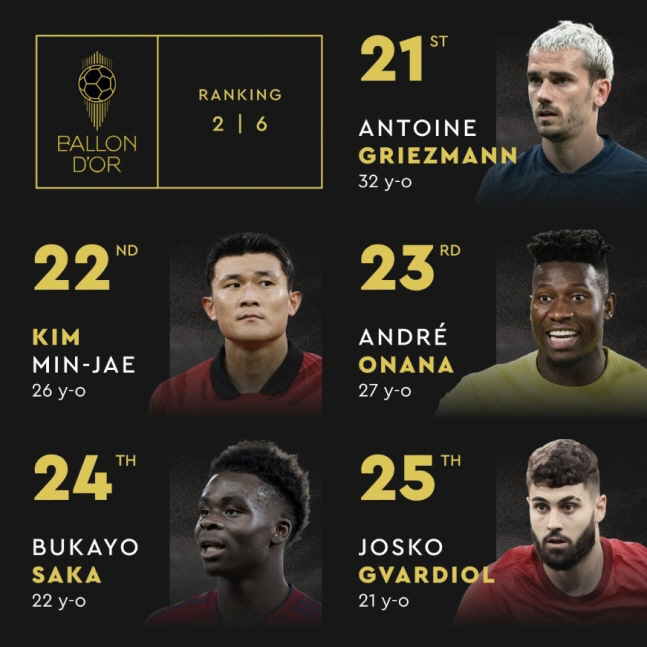 무엇보다 올 해 전세계 모든 센터백 중 가장 높은 순위를 기록했다. '프랑스 풋볼'은 본격적인 시상식을 앞두고 30위부터 차례대로 순위를 발표했다. 발표된 순위는 30위 디아스, 20위 마르틴 외데고르(아스널), 28위 랑달 콜로 무아니(파리생제르맹), 27위 니콜로 바렐라(인터밀란), 26위 자말 무시알라(바이에른 뮌헨), 25위 그바르디올 순서였다. 김민재는 24위인 부카요 사카(아스널)와 23위 안드레 오나나(맨유)가 공개된 후 22위로 이름을 올렸다.