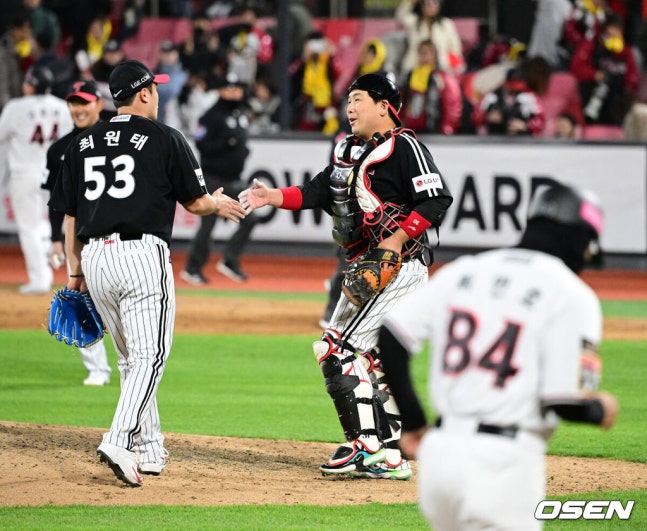 [OSEN=수원, 지형준 기자] 한국시리즈 4차전을 마친 뒤 LG 최원태와 허도환(오른쪽)이 승리를 기뻐하고 있다. 2023.11.11 /[email protected]