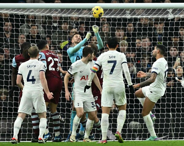 토트넘 비카리오 골키퍼가 8일(한국시각) 열린 프리미어리그 웨스트햄과의 경기에서 공을 펀칭으로 처리하고 있다. 런던/AFP 연합뉴스