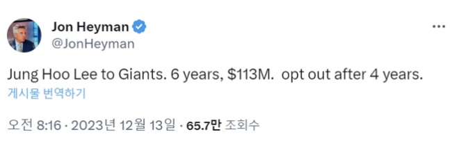 미국 '뉴욕포스트' 칼럼니스트 존 헤이먼은 13일(이하 한국시각) "이정후가 샌프란시스코 자이언츠와 계약했다. 6년 1억1300만달러 조건이며 4년 후 옵트 아웃"이라고 전했다. 뒤이어 'MLB.com' 등 다른 주요 스포츠 전문 매체들도 이정후의 계약 소식을 전했다. 아직 샌프란시스코 구단의 공식 발표나 이정후 측의 공식 입장은 나오지 않았지만 합의에 이른 것으로 보인다.