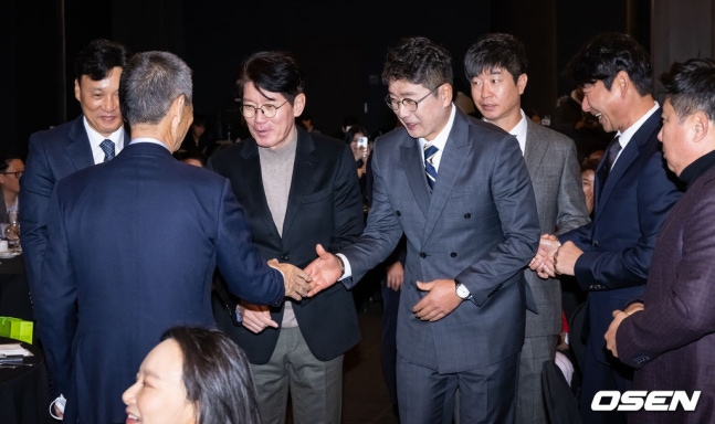 감독 전원은 약속이나 한 듯 일열로 도열, 김성근 감독과 악수를 나누는 진풍경이 펼쳐졌다. 29년만 LG 우승을 일궈낸 염경엽 감독부터 SSG 새롭게 부임한 이숭용 감독까지, 10개 구단 감독들 모두 환한 미소로 김성근 감독을 맞이했다.