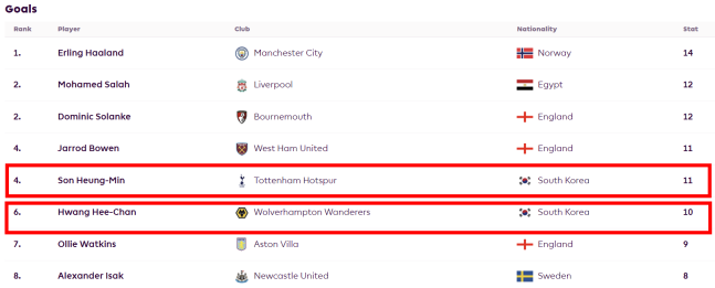9위 : 칼럼 윌슨(뉴캐슬 유나이티드) 니콜라스 잭슨(첼시) 브라이언 음뵈모(브렌트퍼드) 크리스 우드(노팅엄 포레스트) 이상 7골