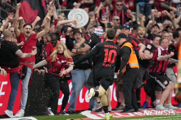 [레버쿠젠=AP/뉴시스] 독일 프로축구 분데스리가 우승을 차지한 레버쿠젠의 플로리안 비르츠. 2024.04.14.