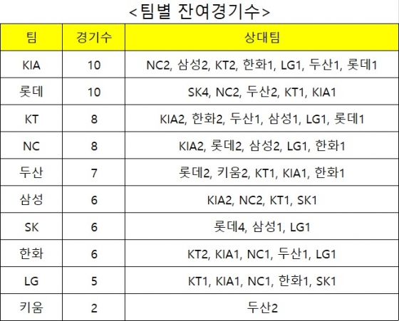 공교롭게 5위를 향한 실낱같은 희망을 품고 있는 KIA와 롯데가 가장 많은 10경기를 남겨뒀다. 두 팀은 26일 월요일을 제외하고는 매일 경기를 치러야 한다.