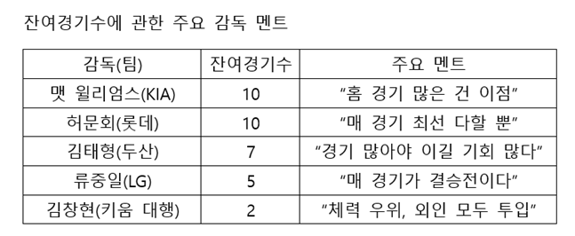 10경기로 가장 많은 경기를 해야 하는 맷 윌리엄스(55) KIA 감독은 홈 경기(8경기)가 많이 남았다는 점을 긍정적인 요소로 꼽았다. 윌리엄스 감독은 "올해 광주의 날씨는 특이했다. 비구름이 없었지만 경기를 앞둔 오후 6시만 되면 비가 내렸다. 아주 이상했다"는 농담을 하며 "홈에서 경기를 많이 한다는 점은 분명 이점이 될 것"이라고 기대했다.