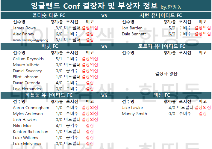 [한띵동] 08/26(월)~08/27(화) 축구 결장자 정보