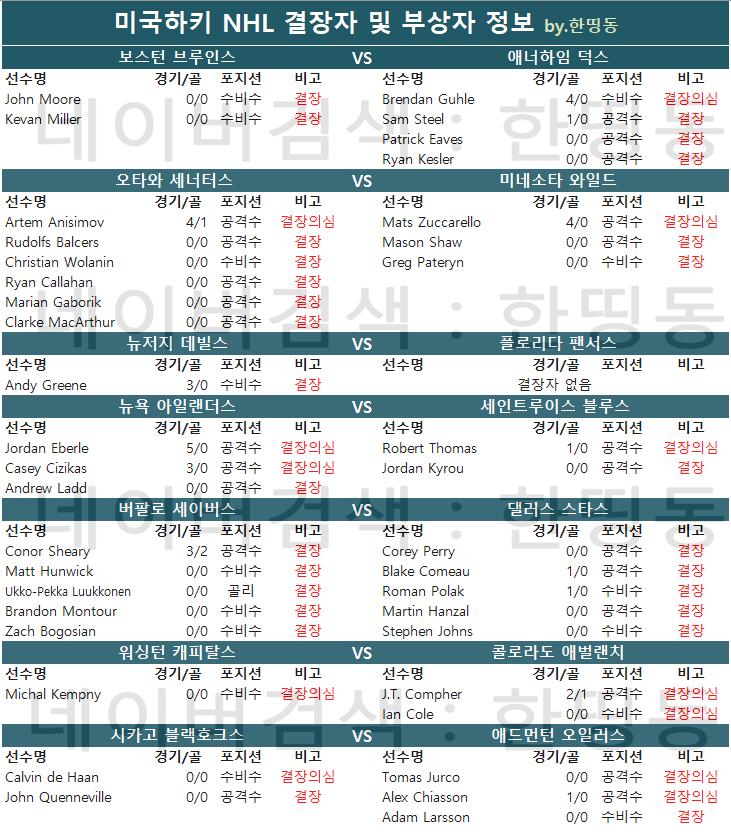 [한띵동] 10/15(화) NHL 결장자 정보