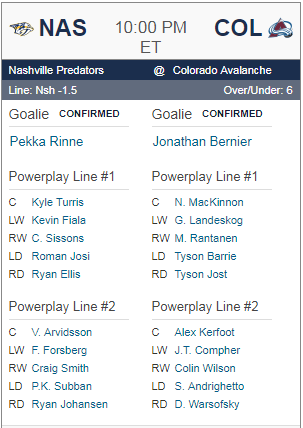 [NHL] 내슈빌 vs 콜로라도 선발 라인업
