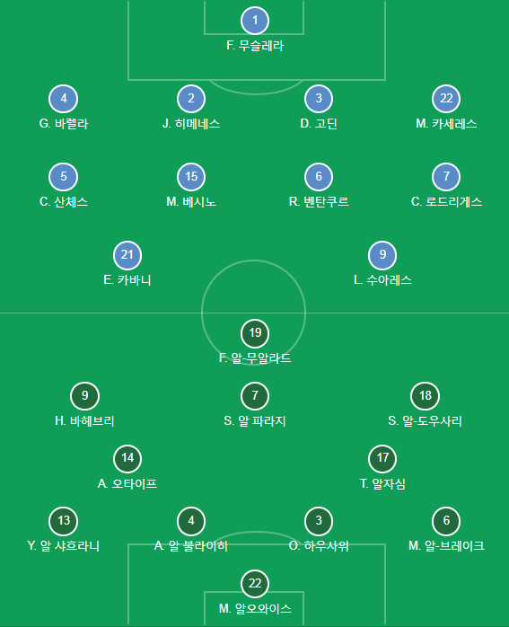우루과이 vs 사우디아라비아 선발라인업 및 포지션