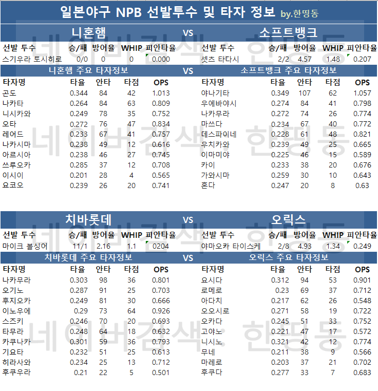 [한띵동] 07/21(토) NPB 일야 선발투수 & 주요타자정보