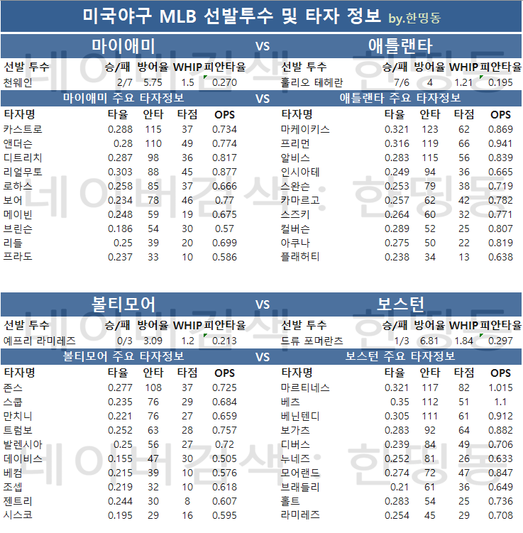 [한띵동] 07/25(수) MLB 메이저리그 선발투수 & 주요타자정보 한띵동 0 2871 0 2018.07.24 22:08 타자정보는 선발타자가 아닌 팀내 안타순으로 정리된거니까 참고해주세요 0