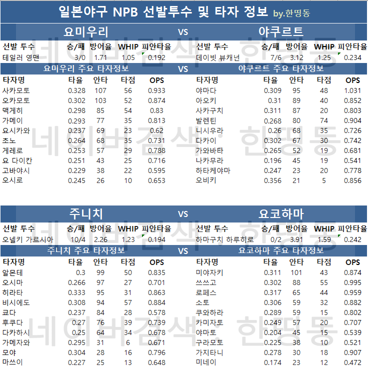 [한띵동] 07/25(수) NPB 일야 선발투수 & 주요타자정보