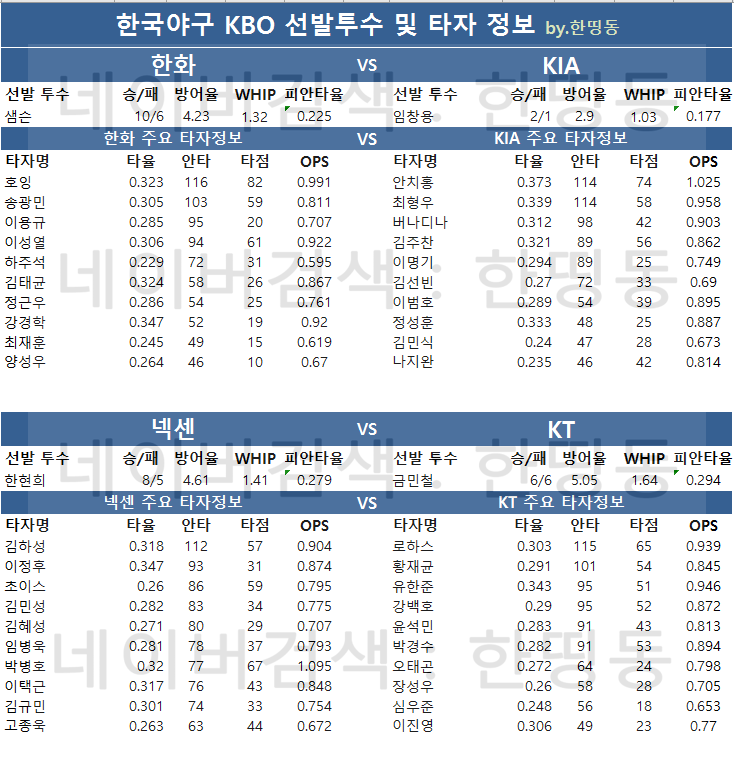 [한띵동] 07/26(목) KBO 국야 선발투수 & 주요타자정보