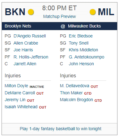 [NBA] 브루클린 vs 밀워키 선발 라인업